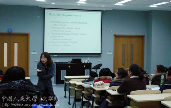23日下午,江教授再次来到国际学院,以“美国对外汉语课堂的特色及其对持照汉语教师的教学技能要求”为题与同学们进行了轻松的交流。