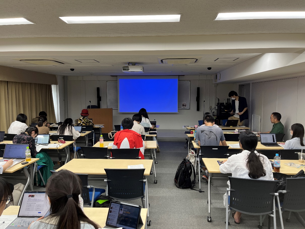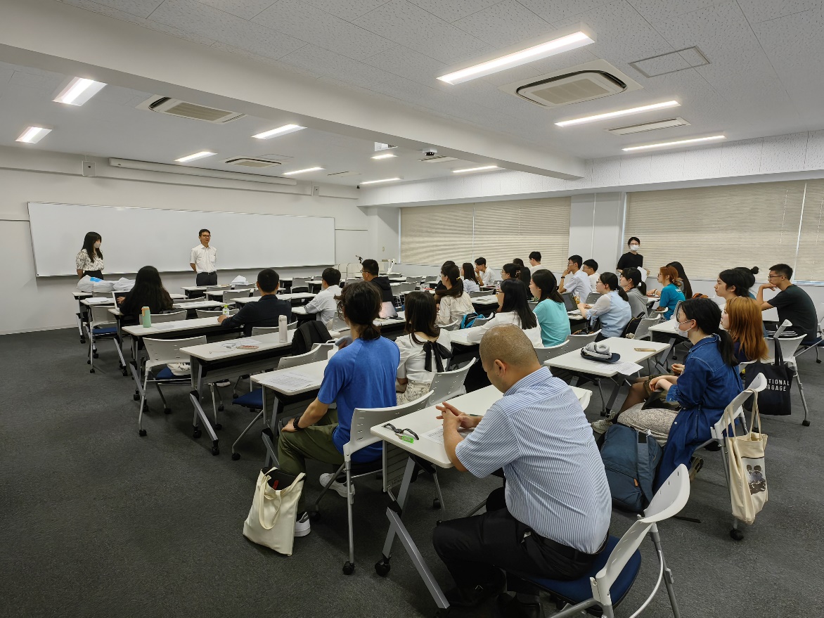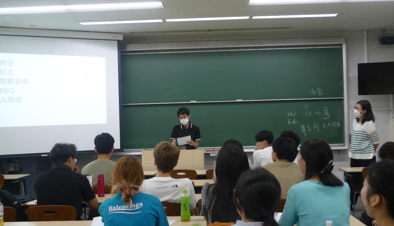 欢迎仪式后,研学团集体旁听了李彦铭老师的中文课堂。该课程专为初学汉语的学生设计,同学就感兴趣的话题用中文进行课堂展示,老师随时对汇报中涉及的汉语字、词及语法加以强调和拓展,这种重视语境、灵活互动的教学方式提高了非中文母语的学生理解与运用中文知识的能力。大家认真听取东大学生的报告,初步了解了日本学生对中国当代互联网热词、日常生活习惯等方面的看法。在随后交流环节中,两校学生使用中、日、英三种语言深入讨论各自的学习经历、专业兴趣,现场其乐融融,气氛十分热烈。