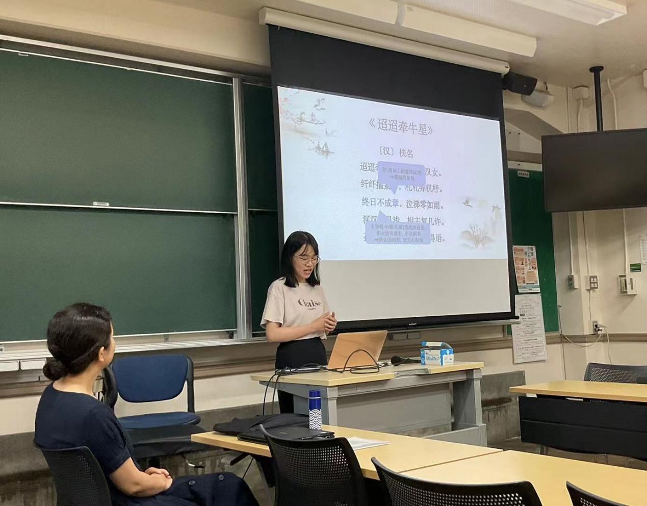 在邓芳老师的“以文学为知的中国古典与现代”课前,研学团成员简述了人大文、史、哲三院学科设置及特色课程,东大学生也介绍了教养学部的特色培养项目,双方在交流中增进了对彼此的了解。课堂上,东大学生以中国传统节日“七夕”为主题,分享了自己对七夕相关的中国诗词的理解与感悟;研学团成员也积极表达个人感悟,交流观点。在邓芳老师的进一步领读下,学生们感受到诗歌中生命流逝与生发的情感和意境,让学生们对诗歌之物、情关系获得了更深刻的体会。