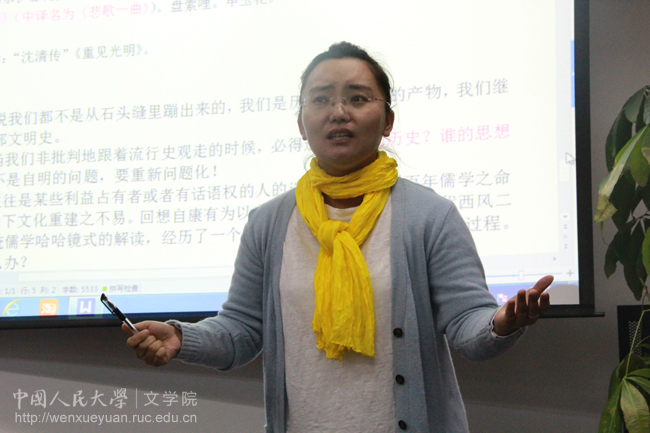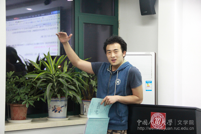 其次,靳老师为我们讲述了文学如何恢复成单纯的审美活动,即老师独特的“戏剧性演绎经典”的方法:将文本转换成“剧本”,使读者通过带入性地对话、表演、朗读,带入自己的生命体验,感同身受地了解经典中的心灵冲突和人物情感。之后,靳老师和同学们利用这一方法,在现场具体演绎了《左传·郑伯克段于鄢》、《战国策·触龙说赵太后》、老舍《断魂枪》、赵大年《西三旗》和《论语·子路、曾皙、冉有、公西华侍坐》几个不同年代的文本。通过文本演绎,靳老师表达了古今经验能够相通,并且传统的人文主义文本细读法就能够达至理解之境的观点。