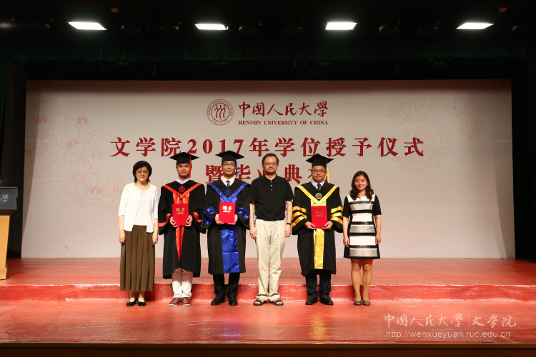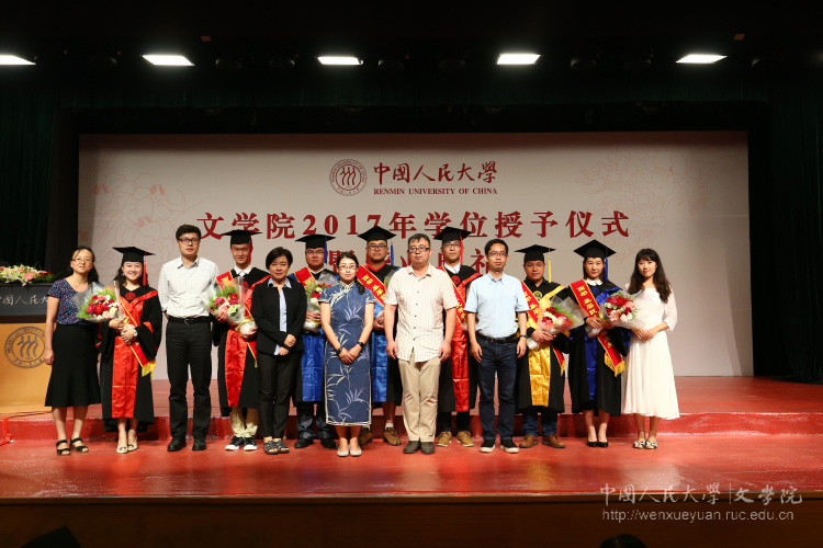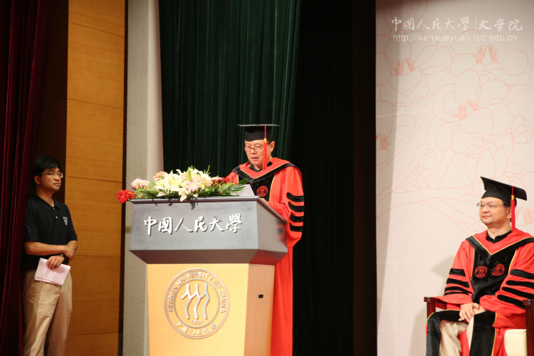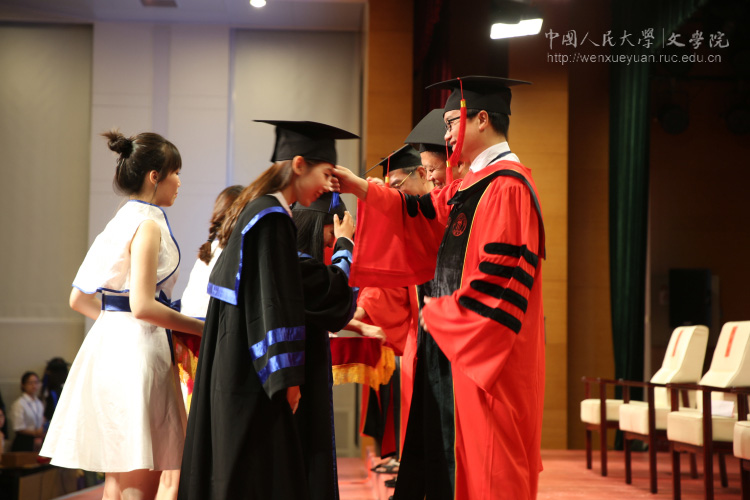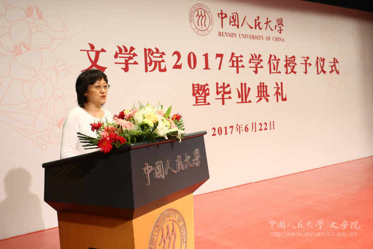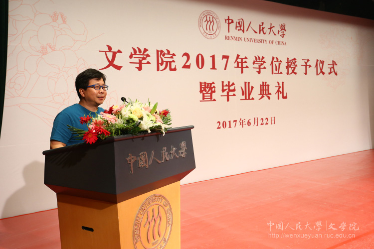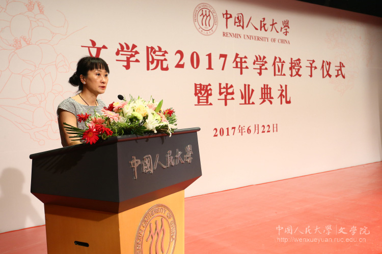 仪式第五项,班主任代表与导师代表分别发言,两位老师都祝贺了各位毕业生顺利完成学业。2013级本科班主任陈涛老师回忆起了四年间和同学们相处的快乐点滴,诉说了自己对同学们的感谢以及对他们未来的期望,恳切的话语中也流露着些许分别的感伤。陈涛老师送给各位同学三句临别赠言:“首先,珍惜你的人文素养;其次,尊重多元的文化和生活方式;再次,懂得付出和感恩。”其后,导师代表杨联芬教授也做了发言,杨老师感谢同学们的宽容、信赖和鞭策,用美好的青春丰富了老师的人生,启迪了教学。同时她勉励学生“穷不失义,达不离道”,她最后说“母校,老师们,一如既往地关注着你们,欣赏着你们,爱着你们”。