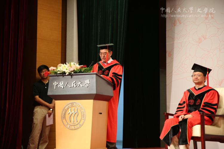 仪式第七项,家长代表发言。2013级本科班郭澄澄同学的家长郭晓东先生首先对学校、老师和同学都予以感谢,从“三代人大人”出发,希望毕业生们能时刻秉持睿智的思想和博大的情怀,尊重文字,尊重自己笔下的每一个标点符号,不说假话,不说虚伪的话,在每一篇文章中都能谨遵我们人大的校训:实事求是。