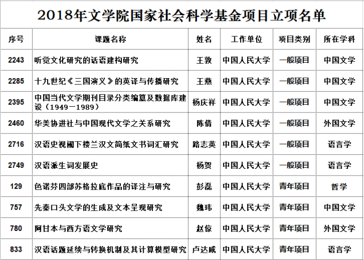 王敦副教授的“听觉文化研究的话语建构研究”、王燕副教授的“十九世纪《三国演义》的英译与传播研究”、杨庆祥副教授的“中国当代文学期刊目录分类编篡及数据库建设(1949—1989)”、陈倩副教授的“华美协进社与中国现代文学之关系研究”、青年教师路志英的“汉语史视阈下楼兰汉文简纸文书词汇研究”、青年教师杨贺的“汉语派生词发展史”等6项获批为国家社科基金一般项目。彭磊副教授的“色诺芬四部苏格拉底作品的译注与研究”、青年教师赵倞的“阿甘本与西方语文学研究”、卢达威的“汉语话题延续与转换机制及其计算模型研究”以及博士后魏玮的“先秦口头文学的生成及文本呈现研究”获批为国家社科基金青年项目。