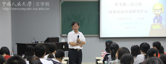 9月27日晚七点,在人大国际学院修远楼213室,12级汉教专业的师生们以热烈的掌声欢迎上海师范大学对外汉语学院院长齐沪扬教授做客苏州并带来专题讲座“作为第二语言的汉语语法应该研究什么”。