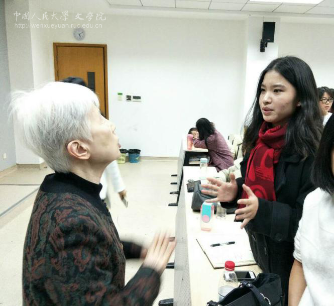 随后,马真教授进一步分析了“有点儿+形容词”所表示的语法意义。她通过列举大量实例分析得出这种用法存在表示程度轻微和表示程度偏离两种不同的语法意义,并分析指出两种用法存在的共性即都包含不如意的意思。同时,马真教授把副词“有点儿”和副词“稍微”“多少”进行比较进一步说明副词“有点儿”的词语用法。讲座最后,马真教授指出从对副词“有点儿”的分析,我们可以体会到如何分析词语的用法和意义,从大的方面说,既要对词语本身进行深入的思考和细致的分析,又得注意跟与之同义或近义的词语进行比较。