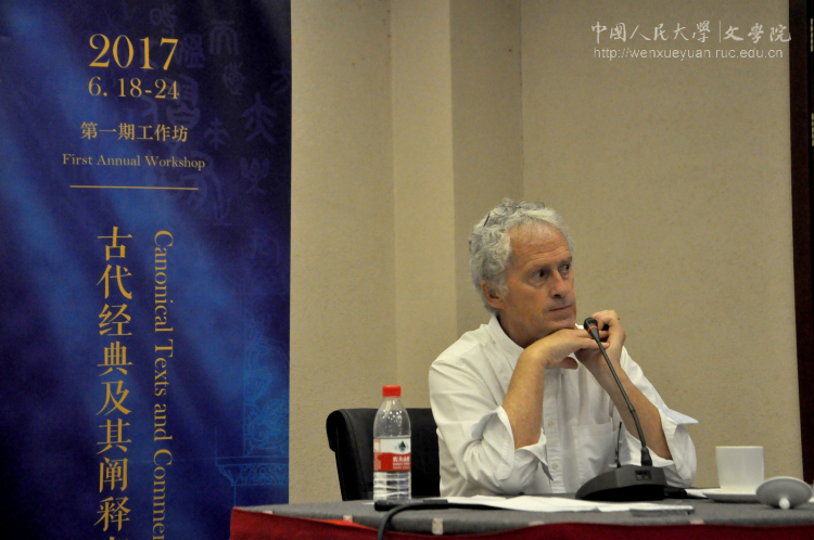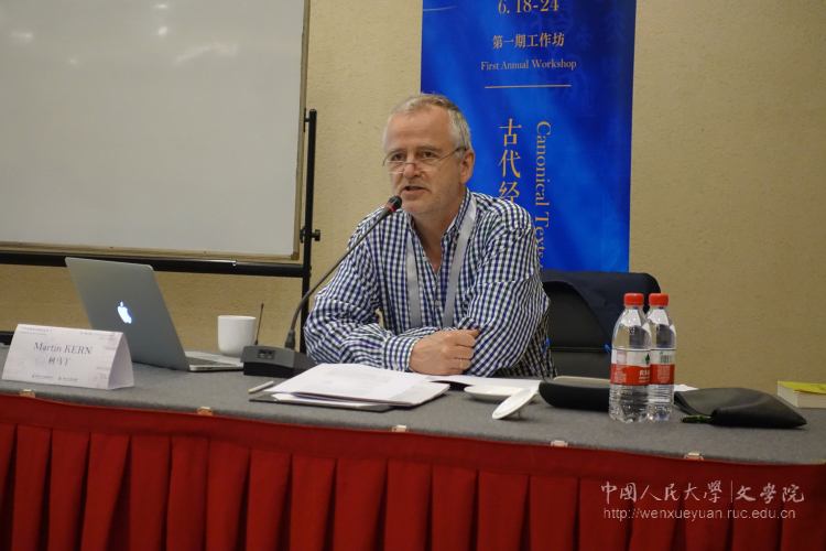 6月19日上午,古代文本文化国际研究中心主任柯马丁教授(普林斯顿大学)向全体与会人员致辞,工作坊正式开幕。柯马丁教授做第一场学术报告。他主要探讨了传世文献和出土文献共有的笺注传统,详述了文献如何汇编,并指出了现代学者处理这些材料时会遇到何种解释学困境。柯马丁(Martin Kern)教授以中国诗歌的源头,也是中国文学中影响最大的文本《诗经》为例,详细分析了一些具体的文本案例,指出对于古代经典文本生产与意义而言,不仅原始作者非常重要,古代注释者和编纂者(包括孔子)也具有同样的重要性。他特别强调了秦汉学者的的前导性影响。事实上,中西方学者对于早期中国文本的研究,都是建立在秦汉学者对早期经典的回顾性评论的基础上。秦汉时代,中国文学的政治伦理传统已经形成。通过对“textual repertoires(文献目录)”和“composite texts(复合文本)”两个概念的分析,柯马丁教授指出早期中国经典文本在传播中口头传统和书写传统会相互作用,那种认为早期中国存在稳定的书写系统的看法,被证明是有问题的。柯马丁教授还向大家展示了——古人如何依据特定时代、特殊情境、社会政治议题的需求,灵活地塑造、重新创作诗或歌。