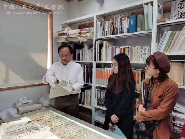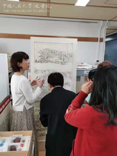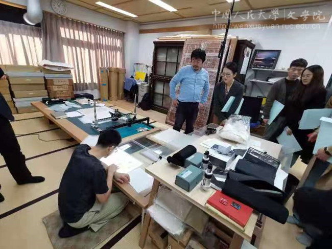 步出书库,大家依次参观了编纂所内的图画摹写室、文稿影写室和文书修复室。三位相关专家分别介绍了自己的工作内容以及专业技术的重难点。图画摹写室的老师介绍道摹写所用材料多是从中国买来的天然颜料,摹写需要仔细比对分析每种颜色的成分;文稿影写室的老师介绍道为了贴近文书的原本效果,自己需要选择不同粗细的毛笔,并在草稿纸上反复练习墨的浓淡、线条的勾连等,有时还要考虑持卷书写和伏案书写的差别;文书修复室的老师介绍自己的工作是把破损的文书修复原样,在修复前需要检测纸张的材料构成,用专门的测量仪器量出每个破损缺口的大小,然后裁剪出相应大小的备用纸,并将备用纸的边缘适当削薄,以达到嵌入原来纸张平整连贯的效果。同学们对此纷纷表示赞叹,三位老师也就同学们的提问进行了补充解释。