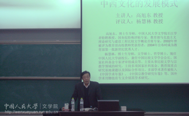 长江学者特聘教授高旭东一起做客人大国际学院语言文化论坛。高旭东教授作为主讲人,杨慧林教授作为评议人,共同为汉语国际教育的同学们带来以《中西方文化的发展模式》为主题的讲座。人大国际学院副院长陈满华教授和相关教师聆听了本次讲座。