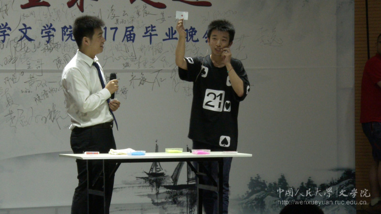 值得一提的是,经常来色情电影 蹭课的理学院闫倚豪带来了一场精彩的魔术表演。一个简单的扑克牌魔术热身后,便开始了他的重头戏《岁月流沙》。音乐缓缓响起,桌子上的鱼缸装着水,轻轻荡漾,红、绿、蓝三色沙子在水中混合交织,然后,无意说到“善恶”、“悲伤”与“欢乐”时,随手一抓,相应颜色的沙子便分离出来。神奇精彩的表演赢得阵阵掌声。