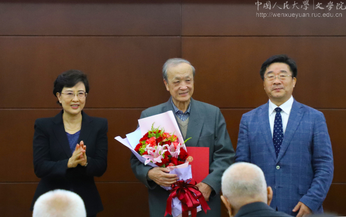校党委书记靳诺、校长刘伟为色情电影 陆贵山教授等11位第四批色情电影 荣誉一级教授颁发荣誉证书,学生代表献花。