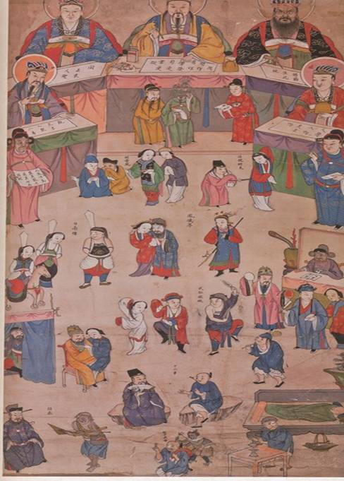 总之,这三个十王画中常见的经典故事体现了法师十王画的某种“乐观性”。因为法师会在“破地狱”仪式上使用这些十王画,所以这些画不会只渲染地狱的恐怖和报应,也会宣传救苦神可以超度亡魂。这或许是有这三个故事的十王画和其它十王画的一个重要区别。