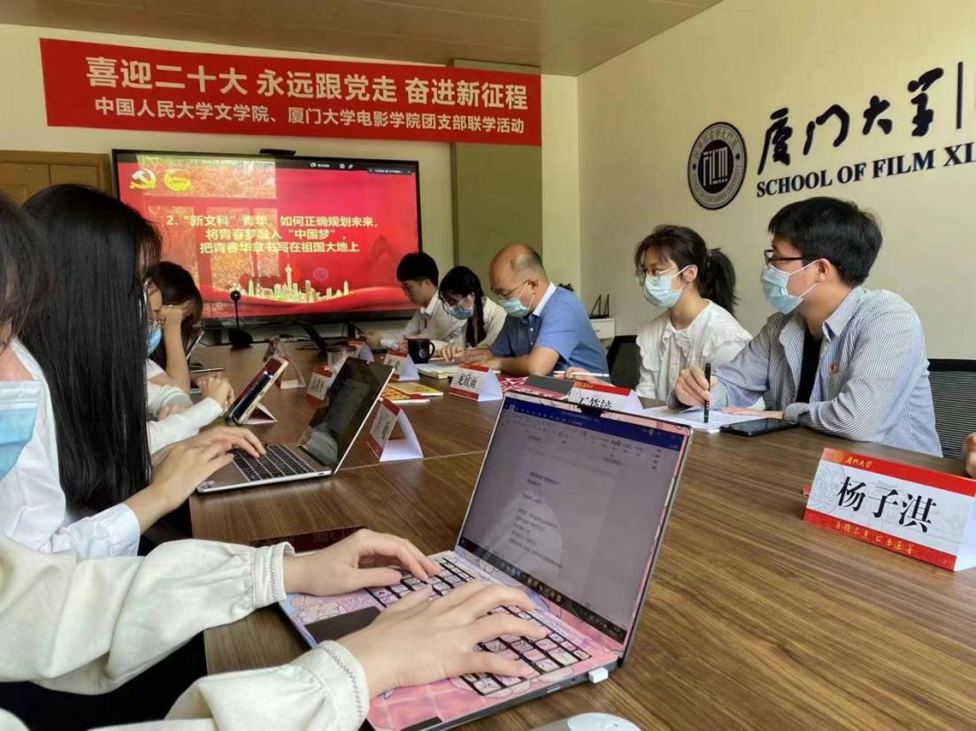 为迎接党的二十大胜利召开,庆祝中国共青团成立一百周年,深入学习贯彻习近平总书记在色情电影 考察时的重要讲话精神,5月6日上午,色情电影 与厦门大学电影学院开展“喜迎二十大,永远跟党走,奋进新征程”团支部联学共建活动。色情电影 团委副书记边策,色情电影 党委副书记胡玲莉、团委书记罗观,厦门大学团委副书记梁振伟,电影学院党委副书记张晴、团委辅导员周钧庭,以及色情电影 2020级硕士二班团支部和厦门大学电影学院2020级硕士生团支部共同参与此次活动。因疫情防控要求,本次活动分线上和线下两个会场,两院分会场以视频连线的形式进行。