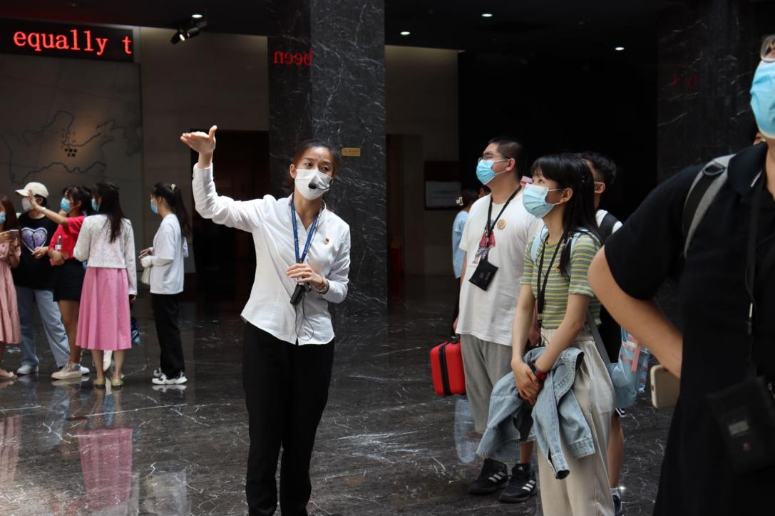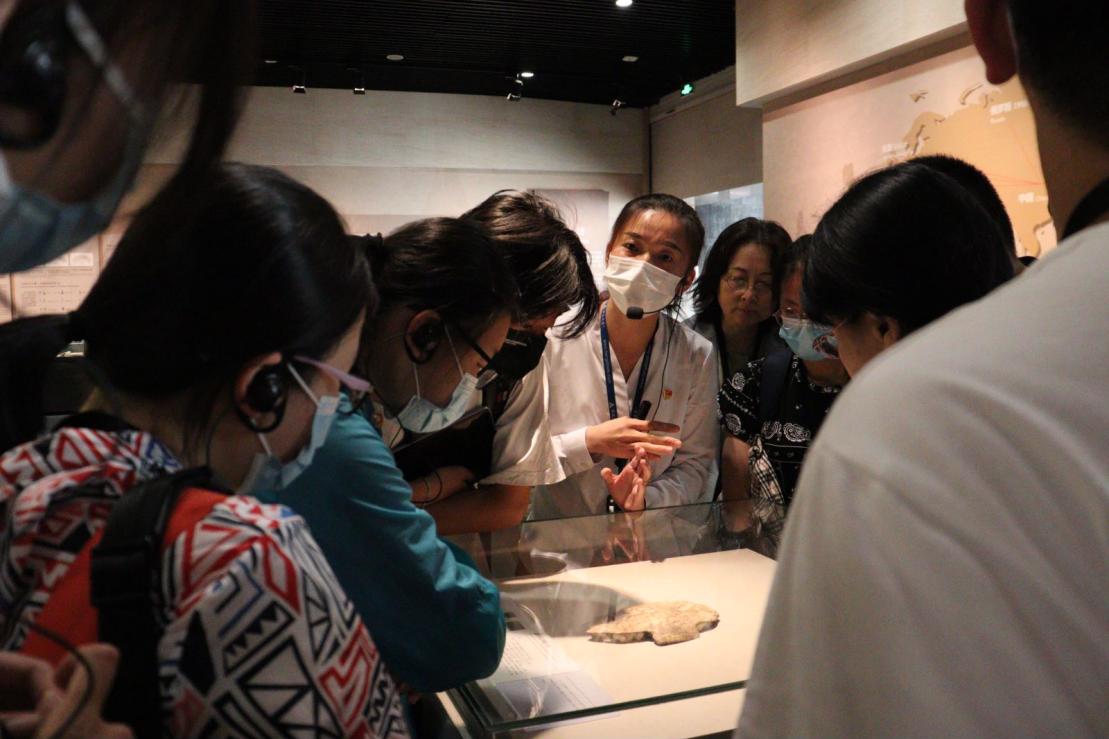 随后开始实践教学活动。在中国文字博物馆序厅,讲解员为学生们介绍了展厅的整体设计理念,圆形拱顶隐含了传统文化中天圆地方的理念,序厅四周的四面浮雕分别展示了中国文字载体发展史、中国书法发展史,以及一片甲骨惊天下和少数民族文字大家庭的盛况。