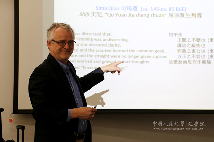 报告会伊始,柯马丁教授介绍说,去年以来他和哈佛大学的宇文所安、科罗拉多大学的柯睿、耶鲁大学的郭明晓同时开设了《楚辞》的课,大家一同带着学生利用12周的课程细读《离骚》。在此基础上他开始思考屈原和《离骚》的关系。柯马丁教授称,屈原和《离骚》的关系是一个自清末廖平以来被反复论及过的话题,特别是胡适在1923年于《努力周报》发表的《读楚辞》一文,影响颇大。随后卫聚贤、朱东润、孙作云等先生对此问题都有专门文章。而日本学者冈村繁1966年发表于《日本中国学报》的《楚辞与屈原——论屈原形象与作者的区别》一文,乃是屈原与《离骚》关系研究最好的一篇论文,其主要观点也是他最为赞同的。此后,许多日本学者也参与到此问题的讨论之中。上述学者均否定了屈原与《离骚》的关系,因此曾被中国学者称为“屈原否定论”。所谓的“屈原否定论”其实是两个问题:一是屈原是否是一个真实存在过的历史人物(他承认历史上应该确实存在过一个历史人物叫屈原),二是屈原是不是《离骚》的作者。
