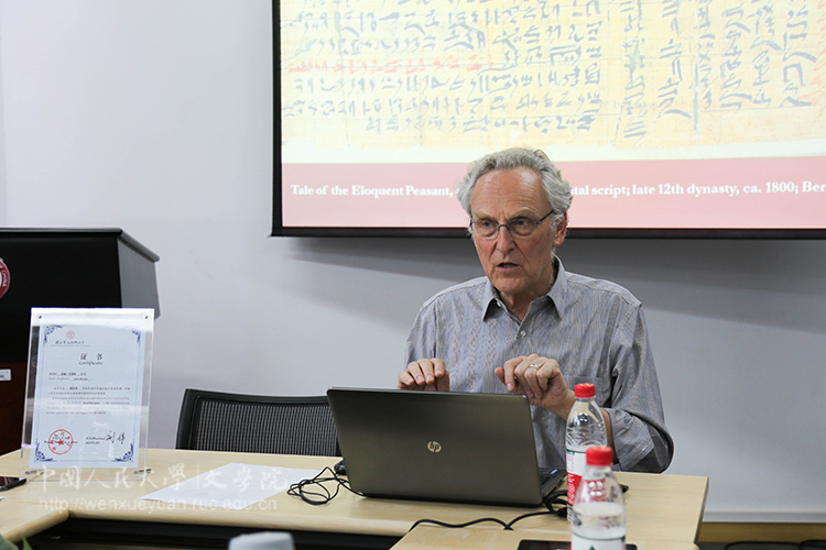 第一讲中,John Baines教授首先展示了圣书体和世俗草体这两种古埃及早期的文字形态,并介绍了纸草文献出土的地点,如象岛、底比斯、孟菲斯等地。然后由现存古埃及最早的文字印迹及纸草文献的物质形态开始,一一介绍了古埃及的各种文字及其不同的书写形态、用法和象征关联,如石碑上的圣书体铭文、象牙法杖背面的保护性文字、陶片上的诅咒文字、印章文字、随葬品上的遗嘱文字等等。其中,John Baines教授指出,现存古埃及文献中圣书体数量较多,是因为其物质载体是石碑而易于保存的缘故。而古埃及人的常用字体是草体(学术界一般称其为僧侣体,但Baines教授表示他并不是很赞同这种命名),但因其书写在纸草上而难以留存。由部分金字塔外墙上的图案也可看出,铭文不仅是文字,也是视觉艺术的组成部分,其字体往往与画面完美融合。另外,有部分纸草文献中用少量的红色字体来表示强调。Baines教授最后说,从他的分析来看,埃及文字并不是早期字母文字的源头,字母文字体系与埃及文字有很多本质上的不同,因此他认为字母文字应该有其他的源头。