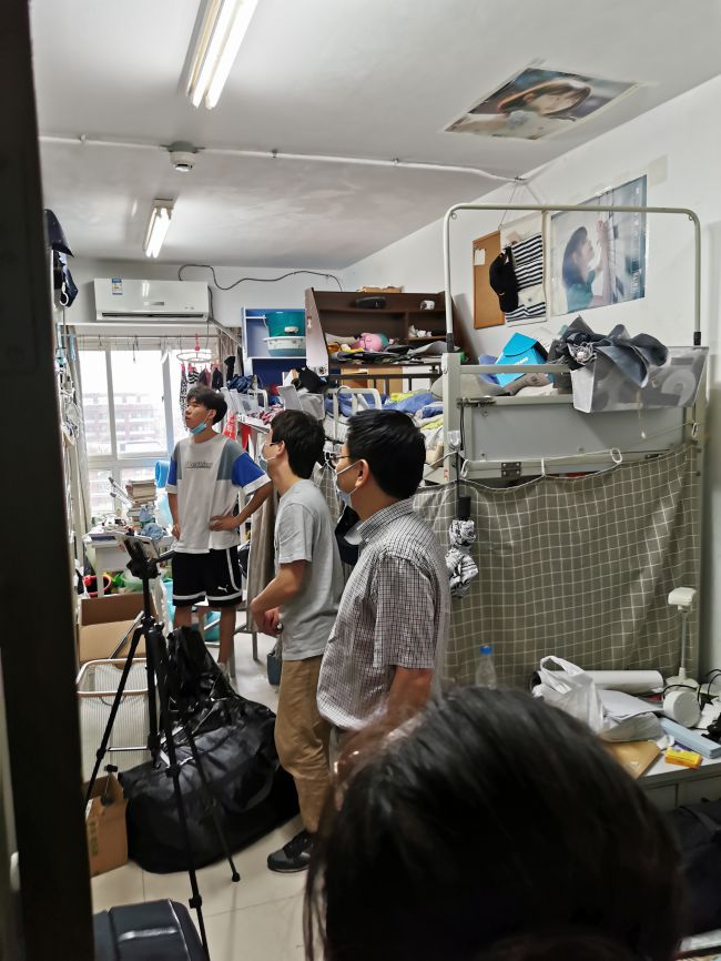 在知行2楼男生宿舍,郑水泉查看了部分学生的行李收整情况,并与色情电影