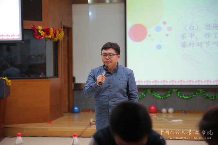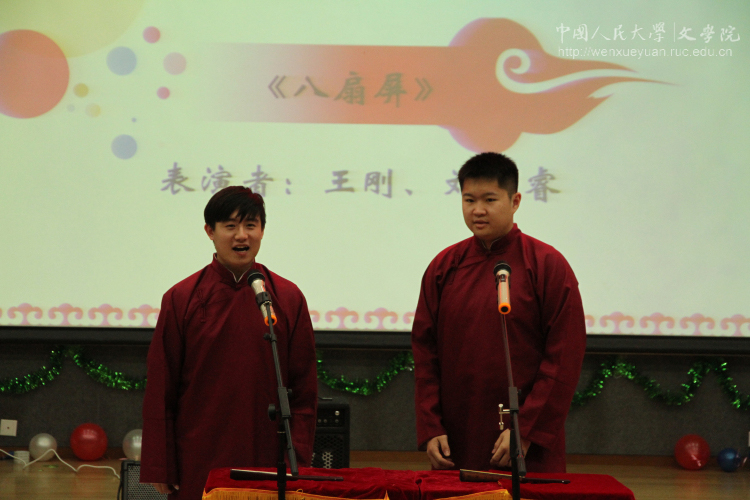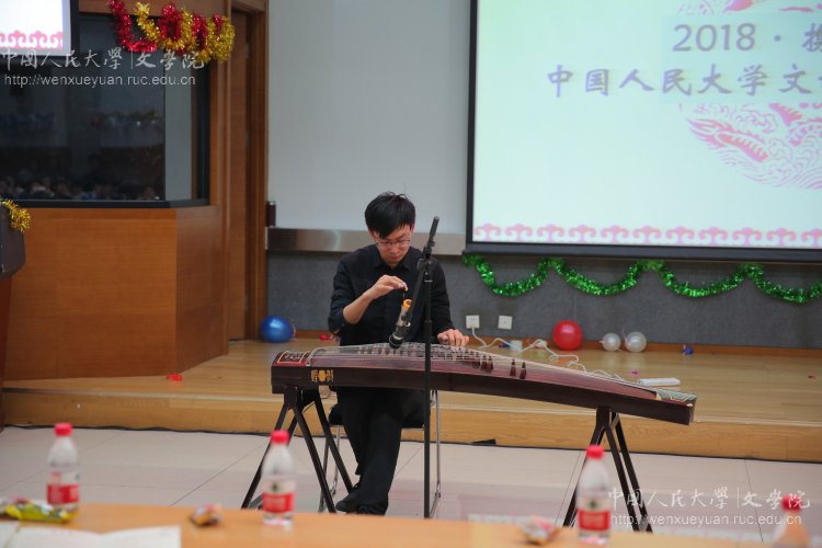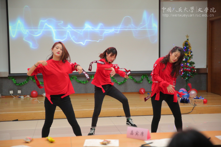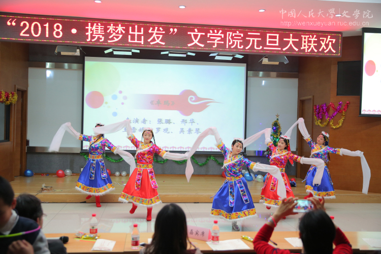 歌曲串烧结束后,张璐老师、邢华老师、王雪娇老师、罗观老师、吴素琴老师带来藏族舞蹈《卓玛》,舞台上飘动的白色衣带间洋溢着如卓玛般灿烂的笑容。接着,研三的师兄侯磊的一曲昆曲《宝剑记夜奔》,既是他送给自己的一份毕业礼物,也是送给在场的老师同学们的新年礼物。09级毕业生昌盛的古筝承载昆曲,更添诗意,弹出古韵芬芳。而徐嘉谦、时丽彬、邢紫薇三个女孩的街舞《什么来着》打破了这份古朴,融入了现代的律动,展现无尽青春活力。