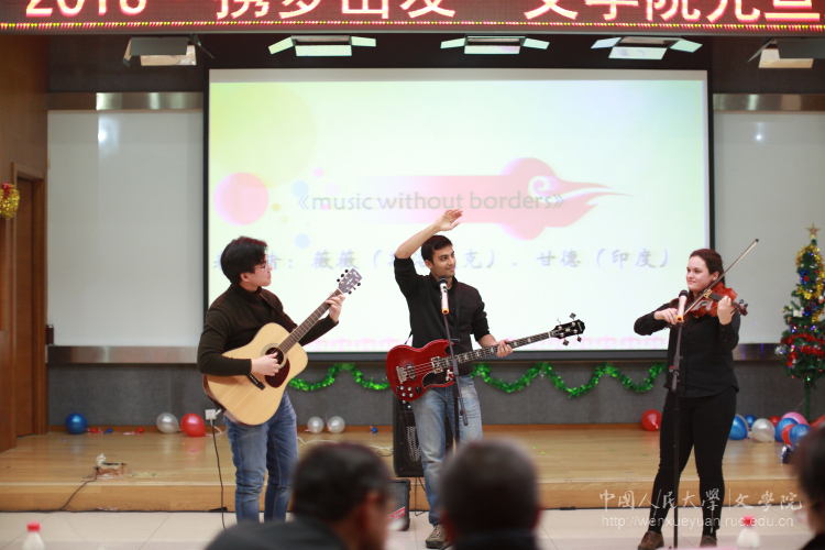 跨年晚会上,文院学子的表演别出心裁,独具匠心,现代与古典的融合,民族与异域风情的串接,让这次晚会异常的精彩。而演出中穿插的“你划我猜”和抽奖活动更是调动了同学们的积极性。不同民族、不同国度的文院学子在今夜齐聚一堂,其乐融融。晚会最后,龚敏、刘未带领全场合唱《明天会更好》,在笑声与歌声中,跨年晚会落下帷幕。